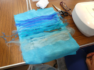 Below you will see a few snaps from last month when we had a felting day by machine and hand. As you will see from my photos I thought the colourful soft wool and threads were just as exciting as the felt making itself. As for the embellisher machine, I think I'd better stay well away as that is something I could get hooked on.